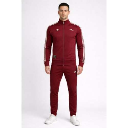Arsenal (ретро-стиль, сезон 25/26): бордовый спортивный костюм adidas Originals — олимпийка на молнии и зауженные брюки. На груди белый Trefoil и клубная пушка Arsenal, по рукавам и плечам — классические контрастные лампасы. Минималистичный винтажный вайб для тренировок и повседневки.