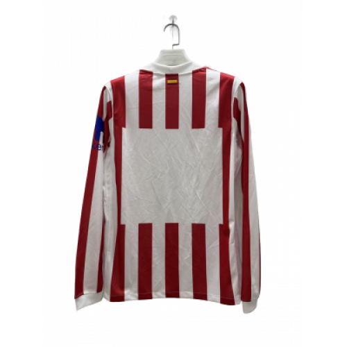 Домашняя игровая футболка «Атлетико Мадрид» сезона 2025/2026 с длинным рукавом выполнена в классическом стиле, вдохновленном богатой историей клуба, и дополнена современными технологическими решениями от Nike. Описание дизайна Традиционные полосы: Джерси возвращается к самому узнаваемому дизайну в истории клуба — пять вертикальных красных полос чередуются с четырьмя белыми. Винтажный воротник: Модель оснащена белым воротником в стиле ретро, что придает форме классический вид. Обновленная эмблема: Герб клуба выделен желтым контуром для лучшей видимости на фоне красно-белых полос. Детали: Логотип Nike и спонсора (Riyadh Air) выполнены в темно-синем цвете. На задней части под воротником расположено изображение испанского флага