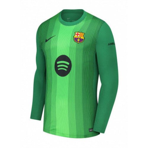 Вратарская форма «Барселоны» сезона 2025/26 от Nike выполнена в насыщенном зелёном цвете с тонкими вертикальными линиями, создающими динамичный визуальный эффект. На груди расположен контрастный логотип Spotify и эмблема клуба, подчёркивающие современный стиль дизайна. Длинные рукава обеспечивают дополнительный комфорт и защиту, а ткань с технологией Dri-FIT ADV эффективно отводит влагу и сохраняет ощущение свежести на протяжении всего матча.