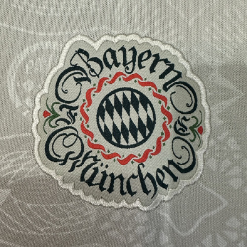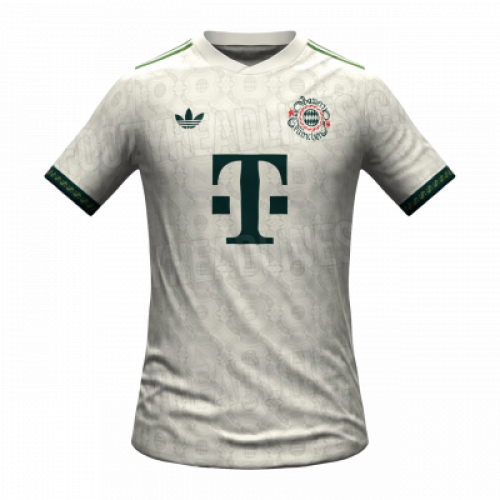 Спецкомплект «Баварии» на сезон 2025/26 посвящен сразу двум событиям: 190-летию фестиваля Октоберфест и 125-летию клуба. Дизайн вдохновлен традиционными баварскими костюмами и элементами формы прошлых лет. Описание футболки: Цвет: Основной цвет — элегантный кремово-белый или светло-бежевый. Детали: Плечи и манжеты рукавов украшены темно-зелеными (оливковыми) вставками с вышивкой в альпийском стиле. Логотипы: Вместо стандартной эмблемы используется специальный герб Октоберфеста с ретро-шрифтом. Логотип спонсора (Telekom) и классический логотип выполнены в темно-зеленом цвете.