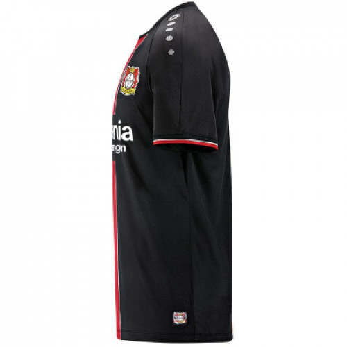 Футболка с коротким рукавом ФК Байер из Леверкузена. Для домашних игр сезона 2018/19. Футболка преимущественно черная и имеет тонкие вертикальные красные полоски по центру. Эти яркие полосы окружены двумя тонкими белыми полосами, украшена гербом клуба,
