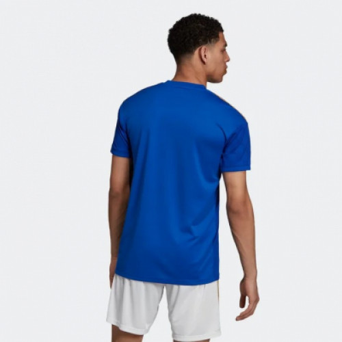 Футболка с коротким рукавом английского ФК Лестер Сити, домашняя, для игр сезона 2019-2020. Футболка однотонная синего цвета, с золотыми полосками по плечам, надписи белого цвета, украшена эмблемой клуба.