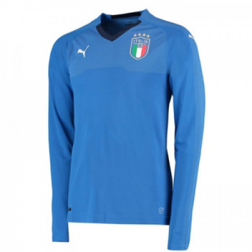 Футболка с длинным рукавом итальянской футбольной сборной,домашняя, для игр сезона 2018/19. Официальный тканый герб STATC (Федерация футбола Италии) с вышитой строчкой на левой стороне груди,V-образный вырез, покрой реглан, Цвет - спокойный синий.