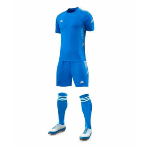 Футбольная мужская спортивная форма. Футболка синего цвета с белыми элементами, шорты синие с белым. На груди и бедре эмблемы адидас.