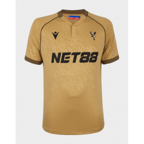 Кристал Пэлас футболка резервная 2025/26 Резервная футболка «Кристал Пэлас» сезона 2025/26 выполнена в изысканном золотистом оттенке с тонким геометрическим узором по ткани, что придаёт форме стильный и современный вид. Чёрные детали на манжетах и воротнике создают аккуратный контраст и подчёркивают премиальный характер дизайна. На груди расположен клубный герб в минималистичном чёрном варианте, логотип производителя и спонсорская надпись NET88, а на спине под воротником — эмблема «орлов», придающая дополнительную идентичность экипировке. Футболка выполнена из лёгкого технологичного материала, который обеспечивает отличную вентиляцию, комфорт и свободу движений как во время матча, так и при повседневной носке. Эта модель — элегантная альтернатива основной форме, идеально подходящая для болельщиков, которые хотят выделяться и оставаться верными «Кристал Пэлас».