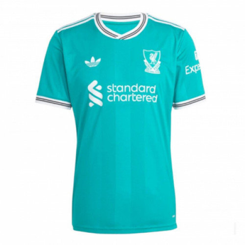 Ливерпуль футболка резервная 2025/26 Резервная футболка «Ливерпуля» сезона 2025/26 выделяется насыщенным бирюзовым цветом, дополненным белыми элементами на воротнике и манжетах. Минималистичный дизайн подчеркивает элегантность и современность экипировки, сохраняя при этом узнаваемый клубный стиль. На груди расположены классический герб «Ливерпуля», логотип adidas Originals и спонсорская надпись Standard Chartered, создающие гармоничное сочетание традиций и актуальности. На спине под воротником нанесён символ памяти — «97» с двумя вечными огнями, отсылающий к истории клуба. Технологичный материал футболки обеспечивает лёгкость, комфорт и хорошую вентиляцию, что делает её удобной как для активных тренировок, так и для повседневной носки. Настоящий вариант для фанатов «красных», которые хотят подчеркнуть свою приверженность клубу вне домашней арены.