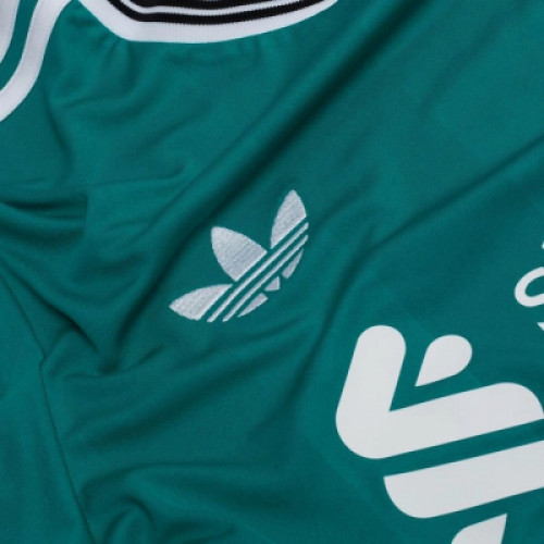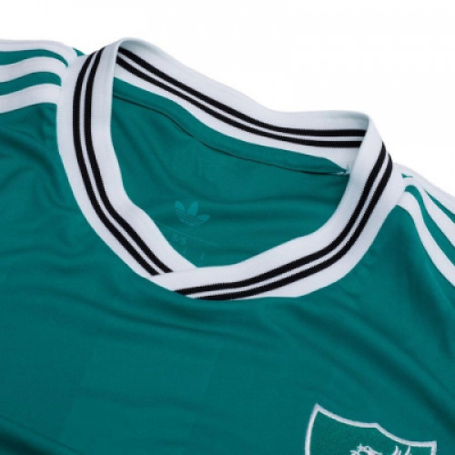 Футболка третья резервная команды Ливерпуль на сезон 25/26. Вышитые логотипы, стильный и немного олдскульный дизайн эмблем. Цвет бирюзовый. Белые манжеты и длинный рукав.