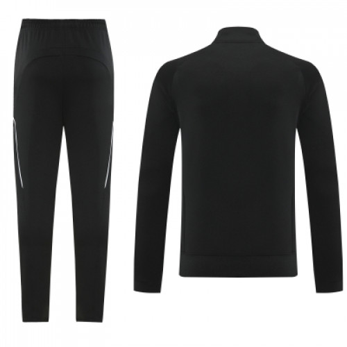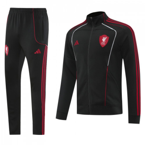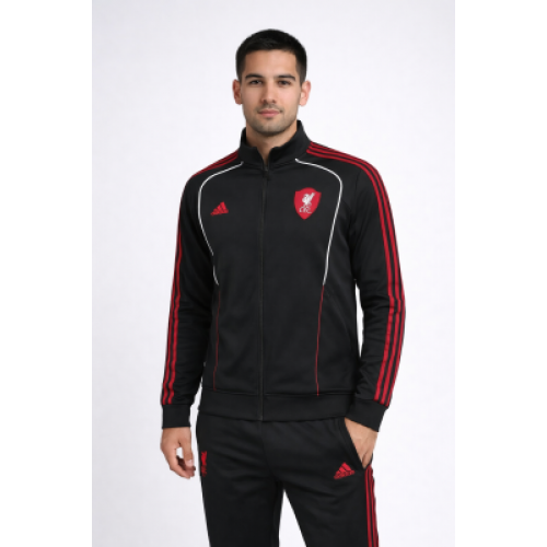 Спортивный костюм Liverpool (сезон 25/26): чёрная олимпийка на полной молнии и зауженные брюки. Красные три полосы и тонкие контрастные линии подчёркивают силуэт, а шеврон L.F.C. на груди и бедре сразу показывает клубную принадлежность. Практичный вариант для тренировок, дороги и повседневной носки — строгий цвет, аккуратная посадка, удобные карманы.