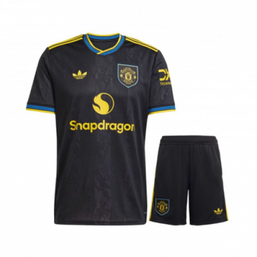 Детская резервная форма Manchester United нового сезона - стильный чёрный комплект с яркими жёлтыми деталями и голубыми акцентами на вороте и рукавах. Цвета смотрятся свежо и заметно: тёмная база делает образ строгим, а контрастные элементы сразу выделяют форму на поле. Отличный вариант, если хочется актуальный дизайн сезона и чтобы комплект выглядел не «как у всех». Подходит для тренировок, игр и повседневной носки, удобно сидит и не мешает двигаться. Отличный выбор для юного фаната Manchester United