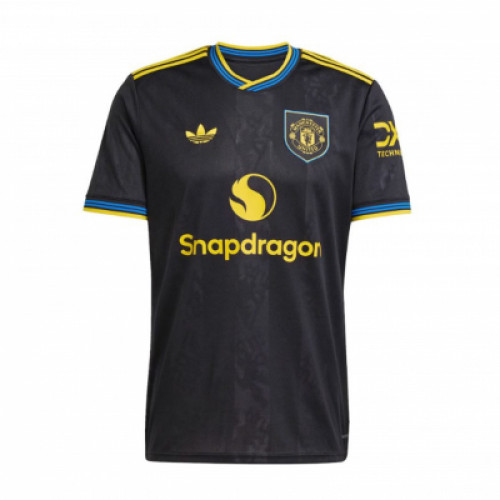 Манчестер Юнайтед футболка резервная 2025/26 Резервная футболка «Манчестер Юнайтед» сезона 2025/26 выполнена в стильной чёрной гамме с контрастными жёлтыми и голубыми акцентами на манжетах и воротнике. Такой дизайн создаёт современный образ, сохраняя при этом клубную идентичность. Особое внимание привлекают детали: затемнённый графический узор на ткани добавляет глубины и динамики, а клубный герб и логотип Adidas выполнены в минималистичном стиле под цвет отделки. Центральное место занимает яркий спонсорский логотип Snapdragon, гармонично вписанный в общий дизайн. Футболка изготовлена из высокотехнологичного материала, обеспечивающего вентиляцию и комфорт даже при высокой интенсивности нагрузки. Это идеальный вариант для фанатов «Юнайтед», которые ценят сочетание традиций и современного стиля.