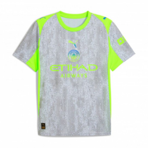 Манчестер Сити футболка резервная 2025/26 Резервная футболка «Манчестер Сити» сезона 2025/26 выполнена в необычном сером цвете с графическим узором, имитирующим капли дождя. Контрастные неоновые вставки на плечах, вороте и боках добавляют яркости и динамики, создавая эффектный современный образ. На груди расположены клубный герб «Сити», логотип PUMA и спонсорская надпись Etihad Airways, выполненные в неоновом стиле, что подчёркивает свежий и дерзкий характер дизайна. Детали на рукавах завершают образ, сохраняя баланс между спортивной строгостью и креативом. Ткань футболки создана с применением инновационных технологий, обеспечивая лёгкость, отличную вентиляцию и комфорт даже при интенсивных нагрузках. Это делает её не только частью официальной экипировки, но и стильным элементом для фанатов, которые хотят выделиться.