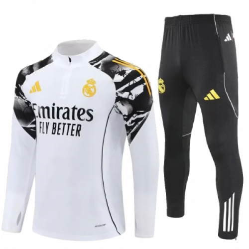 Бело-черный тренировочный костюм Real Madrid x Marvel сезона 2025/2026 — это часть эксклюзивной капсульной коллекции, созданной в коллаборации Adidas и Marvel Avengers. В дизайне используется концепция «Защитим наше поле», вдохновленная историей о том, как игроки объединяются подобно супергероям для защиты родного стадиона. Дизайн и визуальные особенности Цвет и графика: Верх костюма (тренировочный топ) выполнен в белом цвете с графическими принтами в стиле комиксов. Брюки обычно идут в черном цвете с контрастными деталями. Тематика "Тор": Дизайн вдохновлен скандинавскими корнями прозвища «Викинги» и богом грома Тором — на ткани присутствуют золотисто-желтые графические молнии.