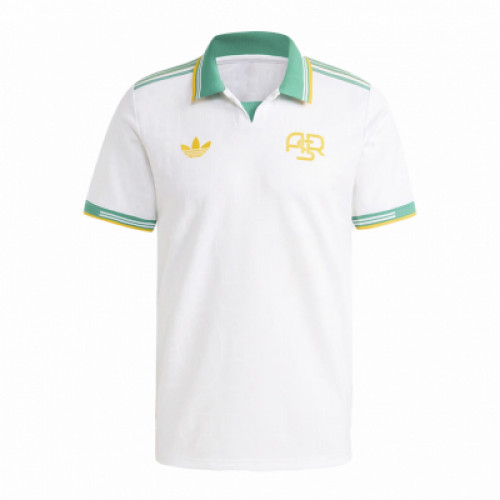 Резервная форма ФК «Рома» в винтажном ключе: чистый белый фон, поло-воротник и контрастные зелёно-жёлтые акценты на вороте, плечах и манжетах. На груди — монограмма ASR и логотип adidas Originals. Лаконичный ретро-дизайн для матчей и повседневного фан-стиля.
