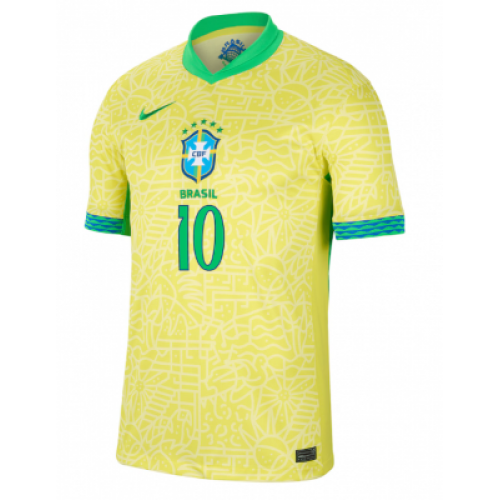 Основные характеристики Цвет: Классический ярко-желтый с едва заметным тисненым узором по всей поверхности, изображающим элементы бразильской флоры и фауны (включая макао и национальные парки). Принт: На спине нанесен официальный шрифт сезона — имя NEYMAR JR и номер 10. На груди расположен малый номер 10. Материал: 100% переработанный полиэстер с технологией Dri-FIT. Ткань эффективно отводит влагу, обеспечивая сухость и прохладу даже в жаркую погоду. Детали дизайна Воротник: V-образный вырез с контрастной зеленой окантовкой. Внутри воротника часто располагается скрытая деталь с надписью «Brasil». Эмблема: Тканый герб CBF (Конфедерации футбола Бразилии) с пятью чемпионскими звездами, расположенный по центру груди (в стиле ретро-форм 90-х).