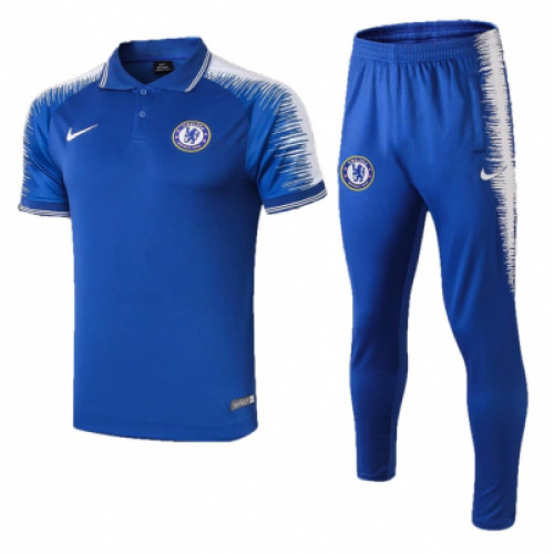 Тренировочный костюм с футболкой-поло ФК Челси. Для тренировок сезона 2018/19. Футболка синего цвета с орнаментом по плечам белого оттенка. Штаны синего цвета с орнаментом белого цвета. На груди эмблема Челси.