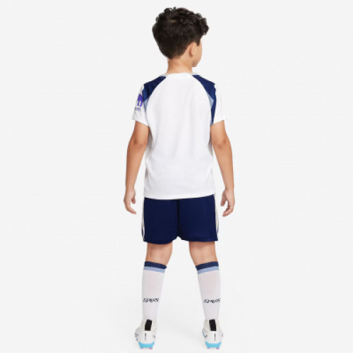 Детская форма с короткими рукавами ФК Тоттенхэм сезона 2025-2026 для домашних игр, белого цвета с синими вставками и с красным спонсором на груди. Окантовка на воротнике и на плечах имеет синий цвет с белыми вставками. Шорты синие с белым. На груди и правом бедре украшена эмблемой клуба