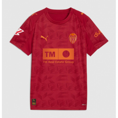 Гостевая форма «Валенсии» сезона 2025/26 от Puma выполнена в насыщенном бордовом цвете с фирменными геометрическими узорами по всей поверхности. Акцентные детали — логотип клуба и эмблема спонсора TM Real Estate Group — выполнены в контрастных оттенках оранжевого. Материал с технологией DryCELL обеспечивает комфорт и быстрое отведение влаги даже при интенсивных нагрузках. Современный крой и лёгкая ткань делают эту модель идеальным выбором как для тренировок, так и для повседневной носки.