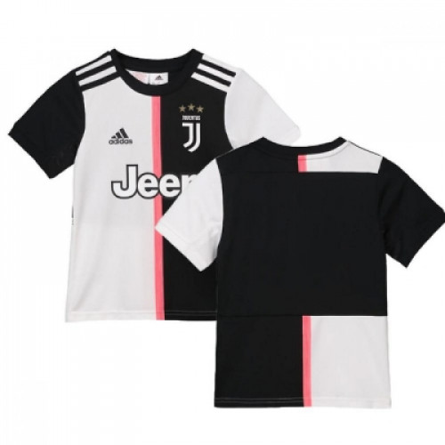 Футболка детская с коротким рукавом итальянского ФК Ювентус. Для домашних игр сезона 2019-2020. Футболка окрашена в чёрный и белый, по центру разделена розовой полосой. Украшена эмблемой клуба. Купить с доставкой по России.