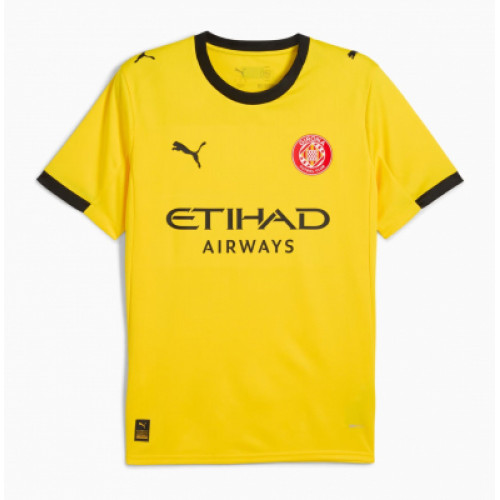 Гостевая форма «Жироны» сезона 2025/26 от Puma выполнена в ярком жёлтом цвете с контрастными чёрными элементами на воротнике и манжетах. На груди размещён логотип спонсора Etihad Airways и эмблема клуба, подчёркивающие современный минималистичный стиль. Ткань с технологией DryCELL эффективно отводит влагу и обеспечивает ощущение сухости и комфорта во время игры. Лёгкий материал и свободный крой делают эту модель идеальной как для поля, так и для повседневного ношения.